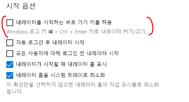 시작 > 설정 > 접근성 > 내레이터 > 내레이터를 시작하는 바로 가기 키를 허용 체크 해제